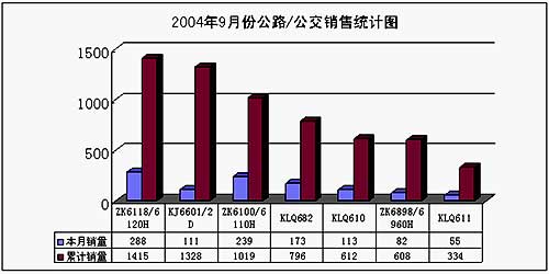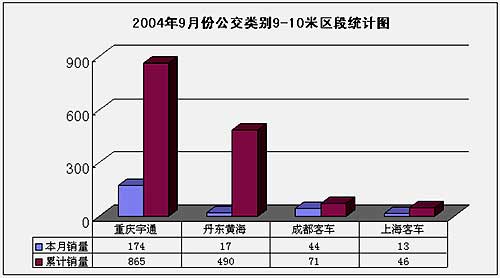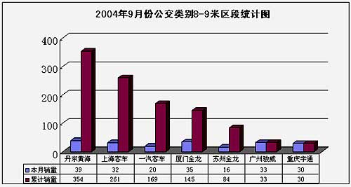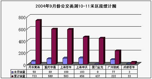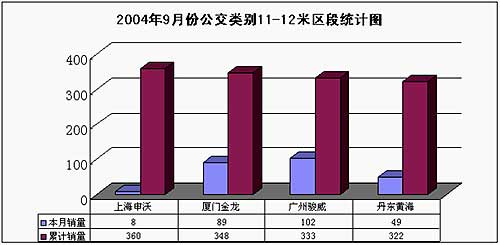 2004年9月份公交類別11-12米區(qū)段本月銷售249輛,1-9月份累c計(jì)銷售1364輛。在本區(qū)段,市場(chǎng)主要集中在上海申沃,廈門(mén)金龍,廣州駿威和丹東黃海等廠家。并且呈現(xiàn)四分天下的形勢(shì)。上海申沃以360輛的累計(jì)銷量,排名第一,但是領(lǐng)先的優(yōu)勢(shì)十分微弱。即使排名第四的丹東黃海與其累計(jì)銷量相差也不過(guò)38輛。 2004年9月份公交類別10-11米區(qū)段共銷售422輛,1-9月累計(jì)銷售3053輛。本區(qū)段的公交市場(chǎng)競(jìng)爭(zhēng)最為白熱化,其銷量也是所有區(qū)段中銷量最高的。丹東黃海以50輛的銷量,733輛的累計(jì)銷量穩(wěn)坐第一。重慶宇通和上?蛙(chē)分列二、三位。在本區(qū)段,上海的客車(chē)企業(yè)還是相當(dāng)搶眼的。 2004年9月份公交類別9-10米區(qū)段共銷售248輛,1-9月累計(jì)銷售1472輛。本區(qū)段歷來(lái)也為公交車(chē)生產(chǎn)企業(yè)必爭(zhēng)區(qū)段,重慶宇通以174輛的銷量,865輛的累計(jì)銷量位列第一。丹東黃海的銷量為17輛,累計(jì)銷量為490輛,位居市場(chǎng)第二。前兩家企業(yè)的市場(chǎng)占有率為92.05%。 2004年9月份公交類別8-9米區(qū)段共銷售205輛,1-9月累計(jì)銷量1076輛。丹東黃海以39輛的銷量,354輛的累計(jì)銷量排名第一。再一次的顯示了丹東黃海的在公交車(chē)市場(chǎng)的地位。上海客車(chē)以32輛的銷量,261輛的累計(jì)銷量排名第二。第三位的是一汽客車(chē),在本月銷售20輛,累計(jì)銷售169輛。 上表為2004年9月份部分企業(yè)生產(chǎn)的公路/公交車(chē)型的本月銷量與累計(jì)銷量。