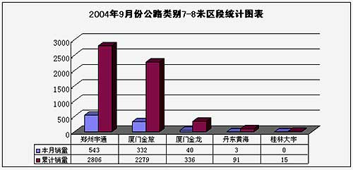 2004年9月份公路類別11-12米區(qū)段共銷售851輛,累計銷售5787輛。其中,廈門金龍以250輛的銷量,1509輛的累計銷量排名第一。鄭州宇通和重慶宇通的銷量分別為109輛、111輛。在本統(tǒng)計圖表中,鄭州宇通和重慶宇通是分別統(tǒng)計,以方便企業(yè)細化市場。 2004年9月份公路類別10-11米區(qū)段共銷售390輛,1-9月份累計銷售2180輛。從收入到本統(tǒng)計圖表中的企業(yè)數(shù)量就可以看出本區(qū)段的市場競爭十分激烈。鄭州宇通以106輛的銷量,670輛的累計銷量位列榜首。一汽客車與廈門金旅分列二、三位。但他們與鄭州宇通的差別不是很明顯。本段市場主要為前三名的爭奪,廈門金龍的累計銷量只有23輛,位列第八。 2004年9月份公路類別9-10區(qū)段共銷售379輛,1-9月份累計銷售1862輛。本區(qū)段市場主要集中在丹東黃海和亞星奔馳。他們分別以151、77的本月銷量和621、571的1-9月累計銷量名列前兩名。廈門金旅和廈門金龍分列三、六名。 2004年9月份公路類別8-9米區(qū)段共銷售724輛,1-9月份累計銷售4840輛。鄭州宇通以276輛的月銷量,1768輛的累計銷量位列第一。“三龍”緊隨其后。廈門金龍的本月銷量為212輛,1-9月累計銷量1326輛。廈門金旅的月銷量為127輛,1-9月份累計銷量815輛。本區(qū)段市場集中度很高。 2004年9月份公路類別7-8米區(qū)段共銷售1372輛,1-9月份累計銷售8575輛。本區(qū)段鄭州宇通以543輛的銷量,2806輛的累計銷量排名首位。廈門金旅的本月銷量為332輛,1-9月累計銷量為2279輛。廈門金龍排名第三。市場競爭主要為鄭州宇通和廈門金旅的爭奪。