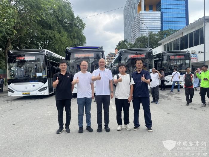 蘇州金龍海外銷售總經(jīng)理姜海峰(左三)與團隊成員在海格客車前合影