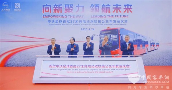 2025年4月24日上午,在春意盎然的美好時(shí)節(jié),一場備受矚目的儀式在熱烈的氛圍中拉開帷幕。申沃全球首款27米純電動雙鉸接公交車發(fā)運(yùn)儀式在上海海通國際汽車碼頭盛大舉行。上汽國際業(yè)務(wù)事業(yè)部、上海申沃客車、上汽國際墨西哥公司、上汽商用車國際、上海海通國際汽車碼頭、外高橋海關(guān)、邊檢、公安領(lǐng)導(dǎo)出席本次活動,共同見證這一具有里程碑意義的時(shí)刻。