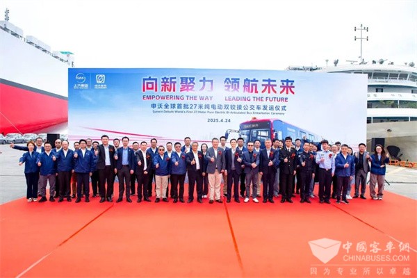在各位領(lǐng)導(dǎo)精彩的致辭之后,活動進(jìn)入了最為激動人心的環(huán)節(jié)——車輛發(fā)運(yùn)啟動儀式。隨著啟動桿向下推動,申沃全球首款27米純電動雙鉸接公交車緩緩駛向運(yùn)輸船只,現(xiàn)場響起了熱烈的掌聲和歡呼聲。隨著全球公共交通行業(yè)的綠色化、智能化發(fā)展,新能源客車市場勢必將迎來更加廣闊的發(fā)展空間。申沃客車也將繼續(xù)堅(jiān)持創(chuàng)新驅(qū)動,不斷提升產(chǎn)品和服務(wù),滿足全球客戶的多樣化需求。同時(shí),申沃客車也將繼續(xù)在上汽集團(tuán)的統(tǒng)籌部署和全力支持下,持續(xù)深化與上汽國際以及上汽商用車國際在海外出口市場的合作,共同推動上汽大客車的揚(yáng)帆出海。
