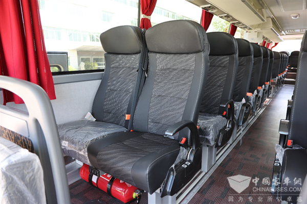 車(chē)內(nèi)座椅為55+1+1的布局共57座。海格新V系的座椅坐墊填充厚實(shí),坐墊長(zhǎng)度長(zhǎng),支持橫向拓寬,對(duì)大體格的乘客非常友好。座椅也采用的是環(huán)保面料,皮革+織物雙拼面,車(chē)內(nèi)暴曬無(wú)異味,坐感柔軟舒適。