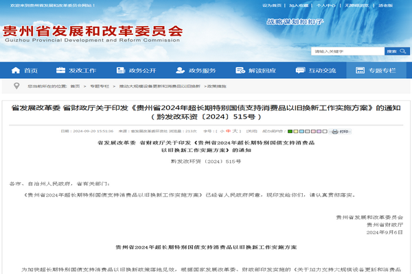 2024年9月6日,貴州省發(fā)展和改革委員會(huì)、貴州省財(cái)政廳聯(lián)合印發(fā)了關(guān)于《貴州省2024年超長(zhǎng)期特別國(guó)債支持消費(fèi)品以舊換新工作實(shí)施方案》的通知【(黔發(fā)改環(huán)資〔2024〕515號(hào))】。
