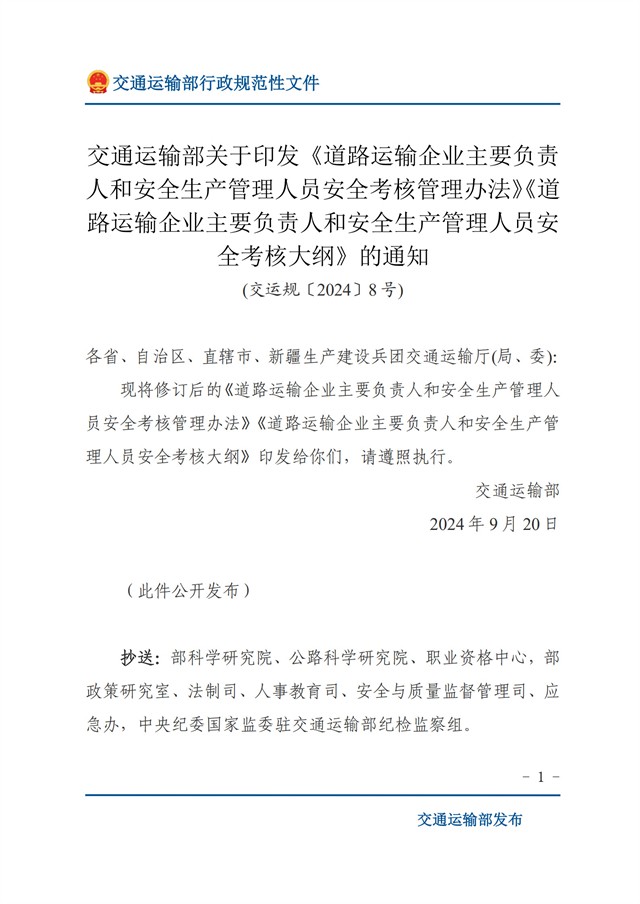 近日,交通運(yùn)輸部修訂印發(fā)《道路運(yùn)輸企業(yè)主要負(fù)責(zé)人和安全生產(chǎn)管理人員安全考核管理辦法》《道路運(yùn)輸企業(yè)主要負(fù)責(zé)人和安全生產(chǎn)管理人員安全考核大綱》(交運(yùn)規(guī)〔2024〕8號(hào),以下簡(jiǎn)稱《管理辦法》和《考核大綱》),自2024年10月1日施行。為便于各有關(guān)部門(mén)單位準(zhǔn)確理解并貫徹落實(shí)好有關(guān)工作要求,現(xiàn)就《管理辦法》和《考核大綱》有關(guān)修訂情況解讀如下: