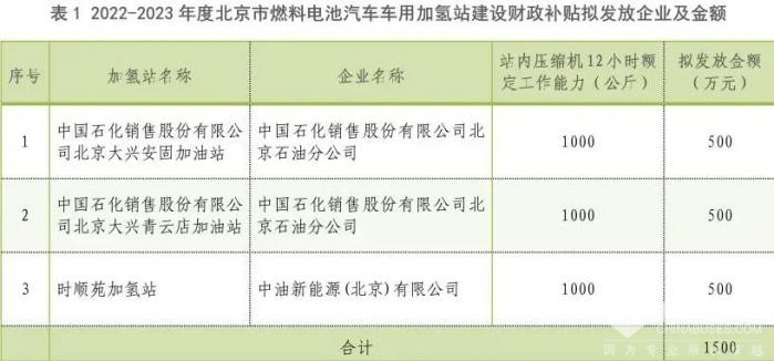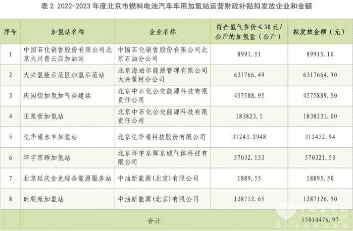 2022-2023年度北京市燃料電池汽車車用加氫站運(yùn)營(yíng)財(cái)政補(bǔ)貼擬發(fā)放企業(yè)為中國(guó)石化銷售股份有限公司北京石油分公司、北京海珀?duì)柲茉垂芾碛邢薰敬笈d黃村分公司、北京中石化公交能源科技有限責(zé)任公司、北京億華通科技股份有限公司、北京環(huán)宇京輝京城氣體科技有限公司、中油新能源(北京)有限公司等6家企業(yè)的8個(gè)加氫站。補(bǔ)貼金額為15010476.97元。