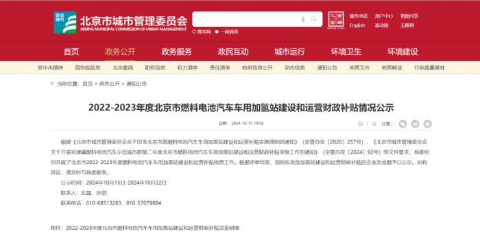 2024年10月15日,北京市城市管理委員會(huì)發(fā)布2022-2023年度北京市燃料電池汽車車用加氫站建設(shè)和運(yùn)營(yíng)財(cái)政補(bǔ)貼情況公示。