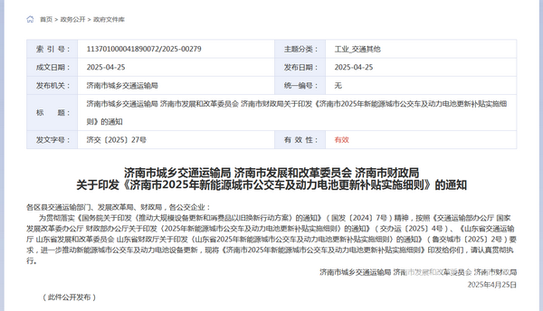 2025年4月25日,濟南市城鄉(xiāng)交通運輸局、濟南市發(fā)展和改革委員會、濟南市財政局聯(lián)合印發(fā)了《濟南市2025年新能源城市公交車及動力電池更新補貼實施細則》的通知【濟交〔2025〕27號】。
