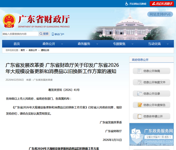 據(jù)中國客車網(wǎng)獲悉,2026年2月6日,廣東省發(fā)展改革委、廣東省財政廳聯(lián)合印發(fā)了廣東省《2026年大規(guī)模設備更新和消費品以舊換新工作方案》的通知【粵發(fā)改資環(huán)〔2026〕41號】。
