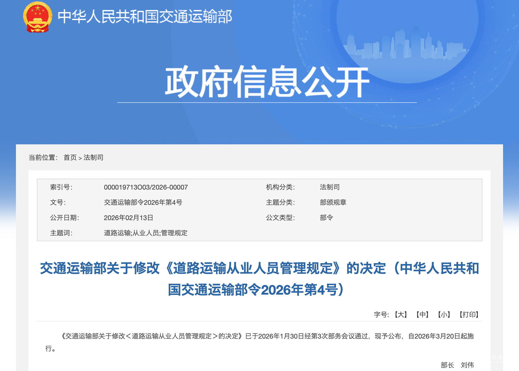 客車網(wǎng)2026年2月26日獲悉,交通運(yùn)輸部發(fā)布《關(guān)于修改<道路運(yùn)輸從業(yè)人員管理規(guī)定>的決定》,其中作出修改,將經(jīng)營(yíng)性道路客貨運(yùn)輸駕駛員、道路危險(xiǎn)貨物運(yùn)輸從業(yè)人員、駕駛操作教練員等相關(guān)道路運(yùn)輸從業(yè)人員年齡要求統(tǒng)一調(diào)整為“年齡不超過(guò)63周歲”,規(guī)定自2026年3月20日起施行。原文如下: