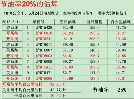 通過油耗計(jì)量儀及公交公司的加油記錄,在上海某公交示范線上運(yùn)營一年來,實(shí)測節(jié)油率大于20%。以某天的對比數(shù)據(jù)為例: