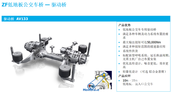 與獨(dú)立懸掛前橋 RL82 EC相配匹的驅(qū)動(dòng)橋AV133是低地板公交車專用驅(qū)動(dòng)橋。采埃孚商用車本土團(tuán)隊(duì)主導(dǎo)開發(fā)設(shè)計(jì)的首款驅(qū)動(dòng)橋產(chǎn)品A133能夠廣泛的應(yīng)用于當(dāng)前傳統(tǒng)能源及新能源商用車型。該產(chǎn)品全新的結(jié)構(gòu)設(shè)計(jì)能大幅降低自身重量,車橋系統(tǒng)重量總計(jì)在 1000 公斤以內(nèi),顯著提高傳動(dòng)效率;結(jié)合全新設(shè)計(jì)的具有寬廣速比范圍的主被動(dòng)齒輪,更能進(jìn)一步降低車輛運(yùn)行時(shí)的能量消耗;緊湊的模塊化設(shè)計(jì)為整車布置預(yù)留更多空間,對(duì)于新能源商用車而言就意味著可以增加更多的儲(chǔ)能設(shè)備。
