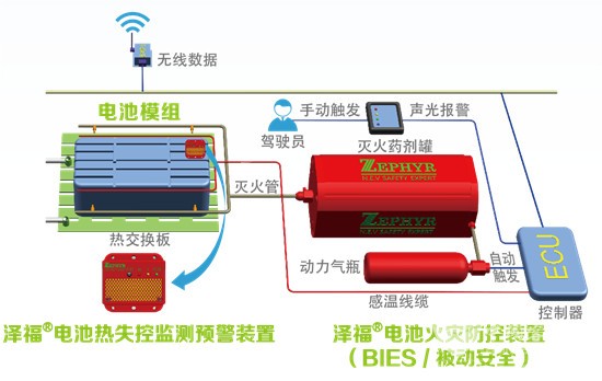 哲弗作為國(guó)內(nèi)鋰電液體滅火首創(chuàng)者,自主研發(fā)的澤福®電池智能液體滅火系統(tǒng)選用瞬間降溫滅火,抗復(fù)燃,不導(dǎo)電,無(wú)殘留的液態(tài)滅火劑,配以高效,精準(zhǔn)的溫度、煙霧、火焰、氣體四合一火災(zāi)的探測(cè)系統(tǒng),對(duì)電池箱,電池倉(cāng)、高壓電器倉(cāng),電動(dòng)機(jī)倉(cāng)等關(guān)鍵區(qū)域進(jìn)行全方位監(jiān)控保護(hù),并完成火情的預(yù)防及撲滅工作,保證司乘人員的人身安全及運(yùn)營(yíng)車輛的財(cái)產(chǎn)安全。