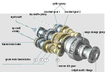 用于客車的12檔ASTronic變速箱采用雙副軸結(jié)構(gòu),是由一個帶倒檔的三檔主變速齒輪部分、安裝在前部的兩對常嚙合齒輪和安裝在后部的高低檔選擇行星齒輪組構(gòu)成。其齒輪組可視為2×3×2結(jié)構(gòu)。