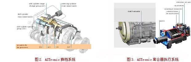 ASTronic 是一款12檔的AMT自動變速箱,即電控機械式自動變速箱。它是由一個電控氣動換檔的常嚙合齒輪變速箱和一個自動控制的干式離合器組成。ASTronic變速箱電子控制單元通過傳感器及執(zhí)行機構(gòu)自動控制離合器的分離與接合、變速箱的升檔與降檔及通過CAN總線實現(xiàn)發(fā)動機轉(zhuǎn)速的同步調(diào)節(jié)等,從而代替原來由駕駛員人工完成的動作。