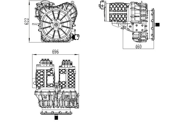 3)電機采用偏置結(jié)構(gòu),軸向距離短,便于車輛布置;規(guī)避“軸套軸”結(jié)構(gòu),可靠性高。