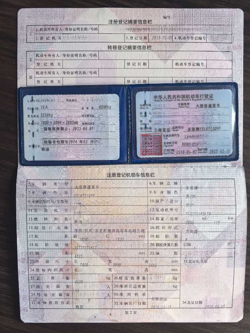 19座亞星6751,2018年 9 月 上牌,大型普通客車,RA425Q163E50發(fā)動機,國五排放,公路客運,同款多臺,隨時提檔過戶。
