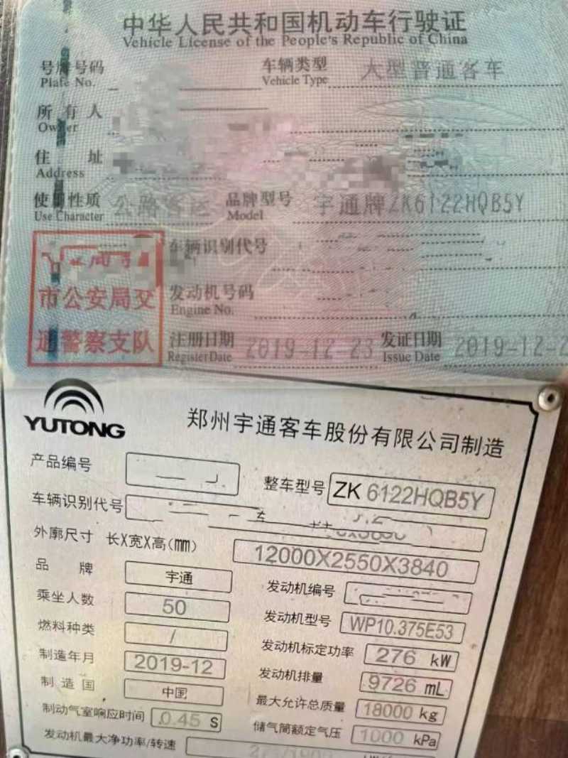 | 客車品牌 | 宇通客車 | 上牌時間 | 2019-12-26 |
