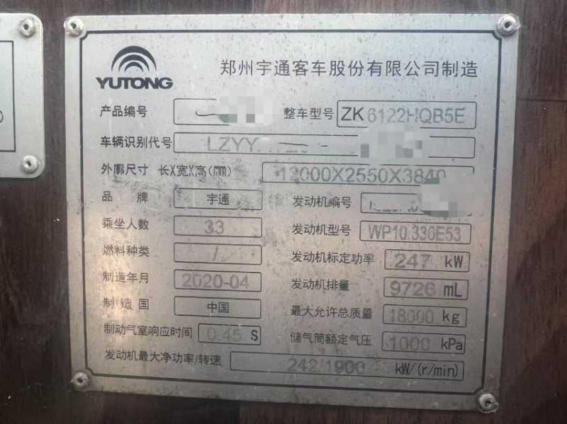 | 客車品牌 | 宇通客車 | 上牌時間 | 2020-04-21 |