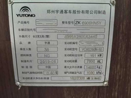 | 客車品牌 | 宇通客車 | 上牌時間 | 2019-06-20 |