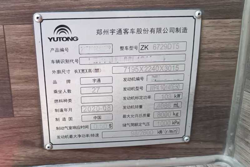 | 客車品牌 | 宇通客車 | 上牌時(shí)間 | 2020-09-17 |