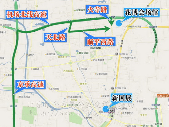 (一)由京承高速路經(jīng)機(jī)場(chǎng)北線高速路、火寺路出口、火寺路;或由機(jī)場(chǎng)北線高速路天北路出口經(jīng)天北路、順平西路至花博會(huì)場(chǎng)館自駕車停車場(chǎng)。