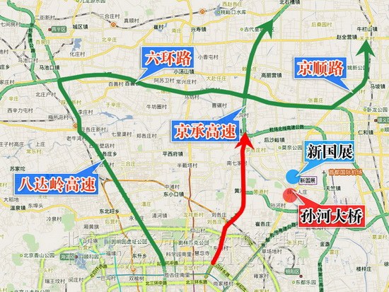 六、由于車展期間京承高速路車流量大,京密路孫河大橋路面施工,易造成交通擁堵。為避免過境車輛和前往懷柔、密云、平谷、承德等方向旅游車輛長(zhǎng)時(shí)間滯留,可分別由下列道路繞行: