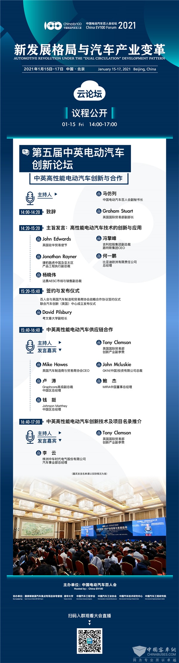 本屆大會首日(即1月15日,周五),將舉辦第五屆中英電動汽車創(chuàng)新論壇,由中國電動汽車百人會聯(lián)合英國國際貿(mào)易部、英國駐華大使館共同發(fā)起,以“中英高性能電動汽車創(chuàng)新與合作”為主題,邀請來中英兩國相關部門、行業(yè)專家和企業(yè)代表共同就中英兩國在高性能電動汽車領域的技術創(chuàng)新和產(chǎn)業(yè)化合作路徑深入探討。