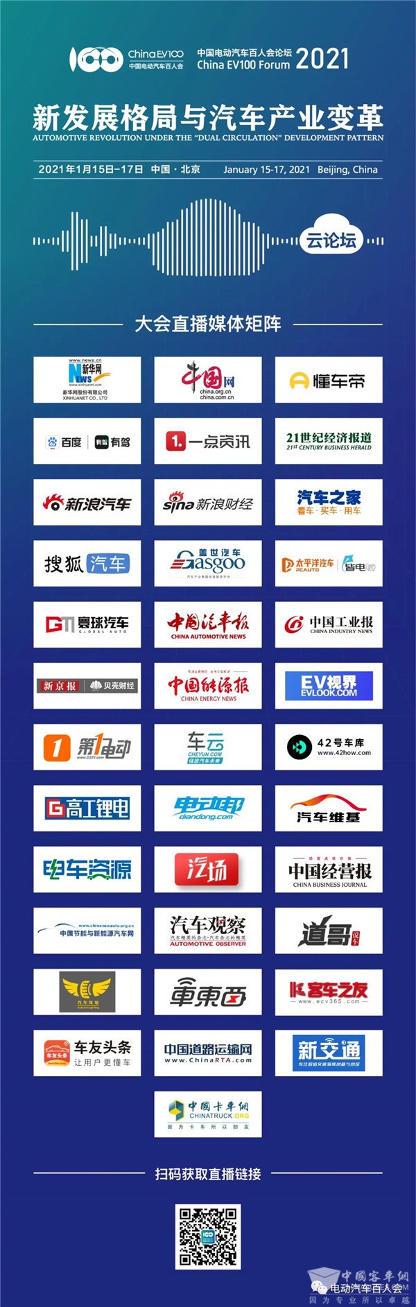 除此以外,客車網(wǎng)、新華網(wǎng)、中國網(wǎng)、新浪汽車、搜狐汽車、21財經(jīng)、汽車之家、懂車帝、百度、一點資訊、V訊網(wǎng)、新浪財經(jīng)、蓋世汽車、太平洋汽車、中國汽車報、中國工業(yè)報、中國能源報、新京報、EV視界等30余家媒體將在大會期間開設直播間,共同組成本屆論壇的視頻直播矩陣,嘉賓也可以通過以上媒體平臺實時追蹤各場論壇直播與會議報道。
