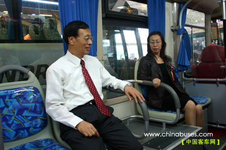 中國道路運(yùn)輸協(xié)會(huì)姚明德會(huì)長和秘書長王麗梅女士親身感受金旅XML6123UE城市客車的舒適