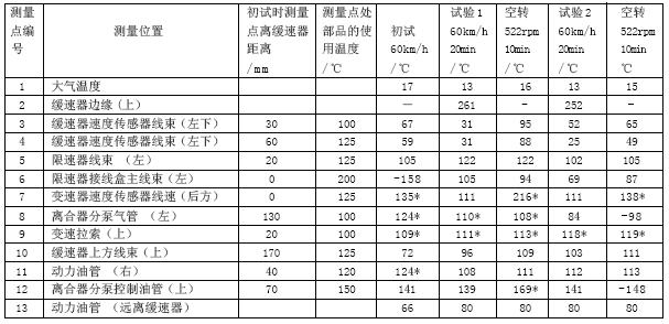 測量緩速器在最惡劣工況工作時其周邊零部件、管及線路離其最近點(diǎn)的最高溫度,從而根據(jù)所獲數(shù)據(jù)拿出相關(guān)防范緩速器熱害的對策。