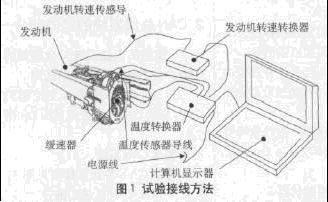 在車上緩速器周邊的零部件、管路及線路上取點(diǎn)(離緩速器距離最近)放置傳感器,傳感器通過導(dǎo)線與溫度轉(zhuǎn)換器連接,溫度轉(zhuǎn)換器把傳感器感應(yīng)到的熱量通過相關(guān)的軟件在計算機(jī)上顯示出感應(yīng)點(diǎn)處的溫度變化情況,最終獲得最高溫度值。增加發(fā)動機(jī)轉(zhuǎn)速感應(yīng)導(dǎo)線后,同時可顯示出各溫度值對應(yīng)的發(fā)動機(jī)轉(zhuǎn)速,試驗(yàn)接線方法見圖1。