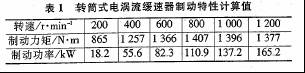 將轉(zhuǎn)筒式電渦流緩速器的設(shè)計參數(shù)代入計算公式,計算結(jié)果見表1。從表1可見,緩速器的制動力矩隨著轉(zhuǎn)速增加而增加,達(dá)到最大制動力矩后隨著轉(zhuǎn)速的增加而下降;而制動功率隨著轉(zhuǎn)速的增加而增加。