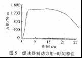 圖5為制動力矩-時間特性曲線,圖6為制動力矩-轉(zhuǎn)速特性曲線。從圖6中可見,制動力矩在轉(zhuǎn)速(800~1000)r/min左右達(dá)到最大,最大值為l418.4N·m,可滿足設(shè)計要求;在制動初始階段,制動力矩隨著轉(zhuǎn)筒轉(zhuǎn)速的提高而迅速增加;在持續(xù)制動階段,制動力矩變化不大;隨著制動時間增加,轉(zhuǎn)筒溫度進(jìn)一步增加,制動力矩下降顯著。