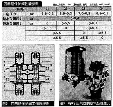 3、四回路保護(hù)閥:保護(hù)閥從結(jié)構(gòu)和功能上可分為有雙回路、四回路、多回路保護(hù)閥。目前在我國商用車中普遍采用四回路保護(hù)閥。其主要作用為:把干燥后的氣體分成4條回路滿足車輛不同系統(tǒng)的需要:行車制動系統(tǒng)、駐車制動系統(tǒng),空氣懸架系統(tǒng)、門控系統(tǒng)等)同時確保當(dāng)某一回路失效時其它回路仍能正常工作,并可適當(dāng)對失效回路氣壓進(jìn)行補充。