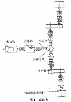 a.支承起后橋并將其固定在臺架的基座上。然后,通過在被試橋的2個輪轂上施加一個制動扭矩使輸入扭矩軸轉(zhuǎn)動。