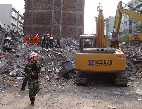 綿竹市城區(qū),到處是斷墻裂壁。配裝玉柴YC6M發(fā)動機的廈工50裝載機一到工地便投入緊張的作業(yè)中。