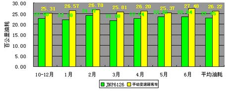 綠色數(shù)據(jù)表示7輛裝有AS-Tronic變速箱的JNP6126客車的平均百公里油耗。黃色數(shù)據(jù)表示9輛裝有手動變速箱的客車的平均百公里油耗。我們可以看到裝有AS-Tronic變速箱的車隊平均百公里油耗為22.95L;而另一個裝有手動箱的車隊平均百公里油耗為26.22L。