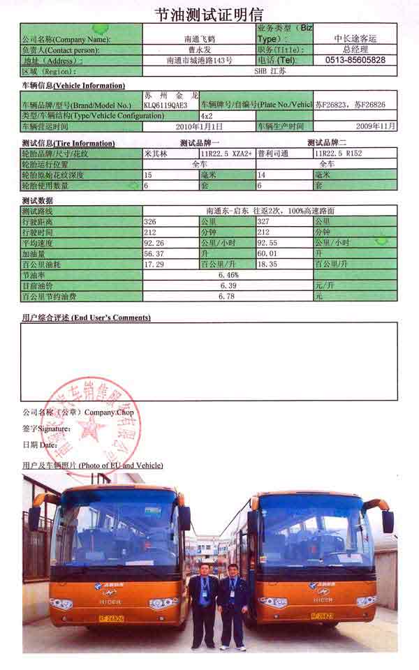 米其林輪胎的節(jié)油效果得到了南通飛鶴、湛江運(yùn)達(dá)等企業(yè)的認(rèn)可,他們發(fā)出了證明信。