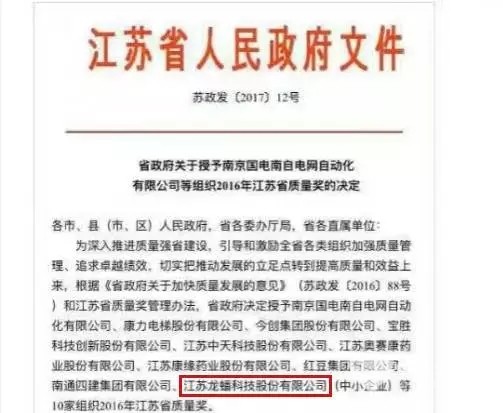 龍蟠科技榮獲2016年江蘇省質(zhì)量獎