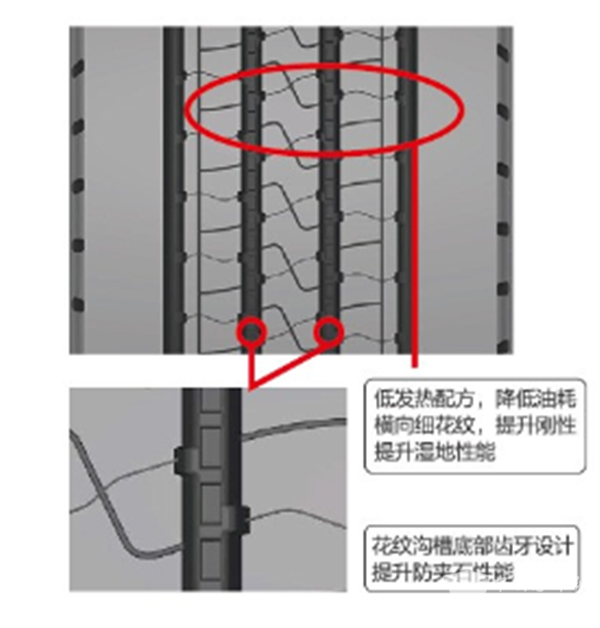 SP196搭載全新胎體結(jié)構(gòu),確保胎面縱向花紋的接地壓力均一性,從而抑制行駛過程中的接地形狀的變化,提升耐偏磨性能。從胎面花紋設(shè)計來看,SP196輪胎采用了5道縱向花紋設(shè)計并調(diào)整花紋深度,從而提升胎面散熱性,降低滾動阻力。胎冠中心采用橫向細(xì)花紋及合理的花紋深度從而增加花紋剛性,提升輪胎的耐磨性和耐偏磨性能;同時橫向細(xì)花紋的增加也提高了輪胎磨耗初期的濕地抓地性能,為客運(yùn)車輛的長途行駛保駕護(hù)航。