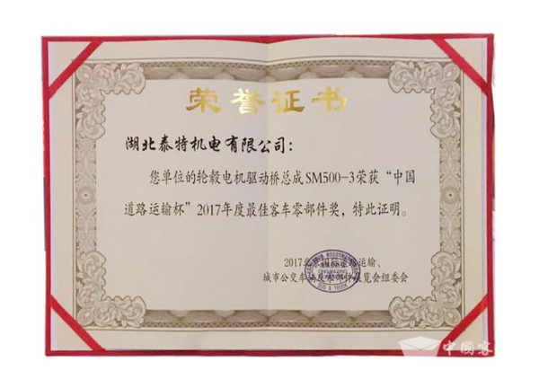 前不久在“2017北京國際道路運輸、城市公交車輛及零部件展覽會”中,湖北泰特機電有限公司研發(fā)的輪轂電機驅(qū)動橋總成SM500-3榮獲“最佳客車零部件獎”。
