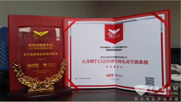 2018年1月12日,由客車網(wǎng)和中國土木工程學(xué)會(huì)城市公共交通分會(huì)聯(lián)合主辦的“第十二屆影響中國客車業(yè)年度盤點(diǎn)活動(dòng)”在北京新世界酒店盛大舉行?;顒?dòng)由宇通客車、金龍集團(tuán)、比亞迪、中通客車、福田歐輝、南京金龍、北方客車、上饒客車、豪沃客車、微宏動(dòng)力、愛普車輛、康明斯、艾里遜、歐科佳、湖北泰特、世紀(jì)聯(lián)保、凱博易控等單位協(xié)辦,同時(shí)活動(dòng)得到了北京公交、上海公交、天津天交、保定公交、新干線、康達(dá)公交、洛陽公交、淮安公交、南寧公交、青島公交、寧波公交、嘉興公交等單位支持。四川天喜車用空調(diào)股份有限公司的天喜牌TX32DS客車純電動(dòng)空調(diào)系統(tǒng)榮獲“中國客車行業(yè)智能電動(dòng)空調(diào)成果獎(jiǎng)”。