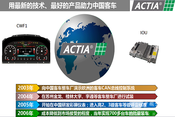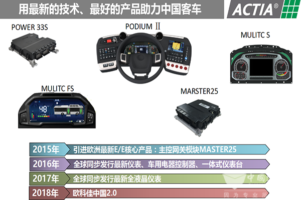 成立于2003年7月的歐科佳(上海)汽車電子設(shè)備有限公司是法國ACTIAGROUP在中國的獨資子公司,2018年也正是歐科佳進入中國市場第15個年頭。15載耕耘,歐科佳公司CAN總線控制系統(tǒng)已成功配套國內(nèi)主流客車企業(yè),如蘇州金龍、鄭州宇通、廈門金龍、廈門金旅、中通客車、青年客車、安凱客車、黃??蛙?、上海申沃、重慶恒通等都是歐科佳的長期客戶及合作伙伴。