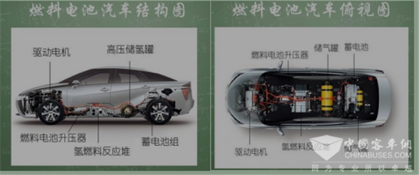 組成:氫燃料電池車主要由高壓儲(chǔ)氣罐、氫燃料電池堆棧、燃料電池升壓器、動(dòng)力蓄電池組、驅(qū)動(dòng)電動(dòng)機(jī)和動(dòng)力控制單元等組成。
