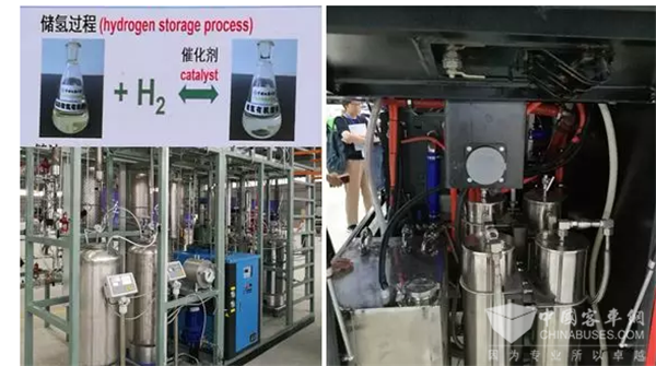 液體有機儲氫材料最大的特點就是常溫下為液態(tài),能夠十分方便地運輸和儲存。整個使用過程中完全通過熱交換降低能耗,且沒有溫室氣體排放,安全保障。其中,武漢氫陽研發(fā)了一種稠雜環(huán)有機分子作為有機液體儲氫材料,儲氫高達58g/L,不存在副產(chǎn)物,可逆性好,并可在常溫常壓下利用管道、槽罐車等運輸。該有機液體儲氫材料已經(jīng)投入應用。圖為武漢氫陽有機液體儲氫。