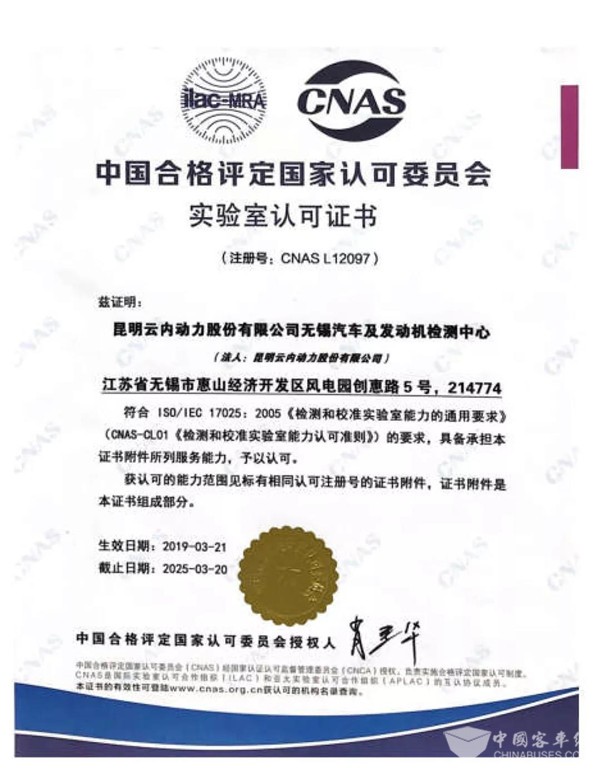近日,“昆明云內(nèi)動(dòng)力股份有限公司無(wú)錫汽車(chē)及發(fā)動(dòng)機(jī)檢測(cè)中心”獲得CNAS實(shí)驗(yàn)室認(rèn)可,允許使用CNAS認(rèn)可標(biāo)識(shí)、ILAC-MRA/CNAS標(biāo)識(shí)和聲明認(rèn)可狀態(tài)。實(shí)驗(yàn)室認(rèn)可是由中國(guó)合格評(píng)定國(guó)家認(rèn)可委員會(huì)(英文簡(jiǎn)稱(chēng)CNAS)對(duì)檢測(cè)、 校準(zhǔn)實(shí)驗(yàn)室及其人員有能力進(jìn)行規(guī)定類(lèi)型的檢測(cè)、校準(zhǔn)所給予的正式承認(rèn)。