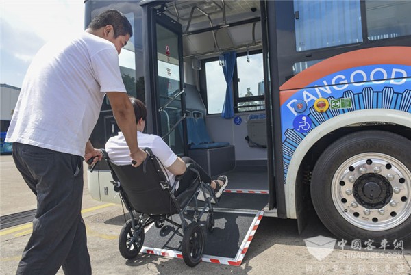 殘疾人或腿腳不便者使用輪椅,如何上下公交車,是需要人抬上去嗎?記者剛想拋出這一疑問,只見駕駛員操縱駕駛裝置,把車廂側(cè)了過來,同時從后車門處打開活動踏板,瞬間變出了一條殘疾人通道。“這是一個黑科技,利用空氣懸架,可以讓車廂側(cè)身,車門隨意變高變低。”吳成輝說。據(jù)現(xiàn)場實測,車門可在距地25厘米與40厘米變動,遇到年老體弱者,降低車門,上車將容易得多。