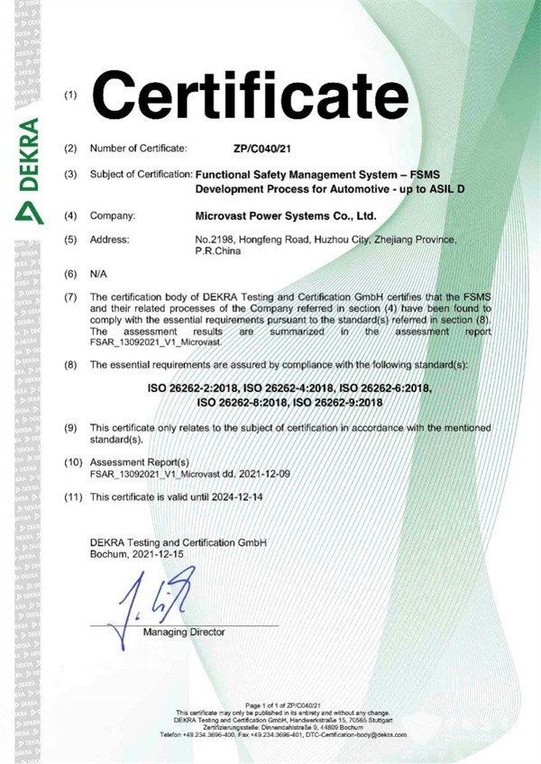 近日,微宏動力的BMS(電池管理系統(tǒng))正式獲得國際權(quán)威認(rèn)證機(jī)構(gòu)德國機(jī)動車監(jiān)督協(xié)會(DEKRA,簡稱德凱認(rèn)證)功能安全國際標(biāo)準(zhǔn)ISO26262:2018 FSMS(Functional Safety Management System)ASIL-D級流程認(rèn)證并頒發(fā)了證書。ASIL-D級是業(yè)內(nèi)汽車安全完整性等級(ASIL)的最高評級,微宏獲得這一認(rèn)證進(jìn)一步表明了微宏動力的研發(fā)能力達(dá)到了業(yè)內(nèi)較高水準(zhǔn)。