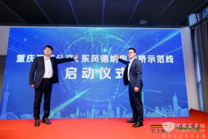 重慶公交集團(tuán)機(jī)務(wù)部副經(jīng)理賴仁強(qiáng)先生和東風(fēng)德納車(chē)橋有限公司市場(chǎng)營(yíng)銷(xiāo)總監(jiān)李靖先生上臺(tái)共同啟動(dòng)電驅(qū)橋示范線。
