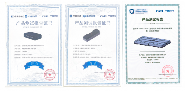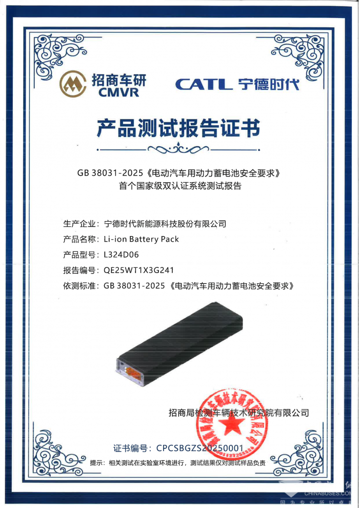 2025年5月7日,寧德時代天行B-客車系列、天行H-重型商用車系列與天行L-輕型商用車系列電池包分別在招商車研、中國汽研、上海機(jī)動車檢測中心等權(quán)威第三方檢測機(jī)構(gòu)通過GB 38031-2025《電動汽車用動力蓄電池安全要求》(以下簡稱“新國標(biāo)”)檢測,成為國內(nèi)首批滿足該標(biāo)準(zhǔn)的商用動力電池,為商用車市場樹立高安全標(biāo)準(zhǔn)新標(biāo)桿。
